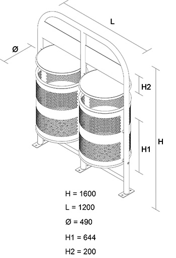 Capacidad: 130 L Acabado: Pintura electrostática con pretratamiento de fosfato de zinc y/o sandblast. Material: Acero al carbón. Colores: Amplia variedad. Vaciado: Se recomienda abatible Anclaje: Atornillar o ahogar en cemento. Referencia (mm): H 1600, L 630, L1 500, Ø 490, H1 650, H2 200