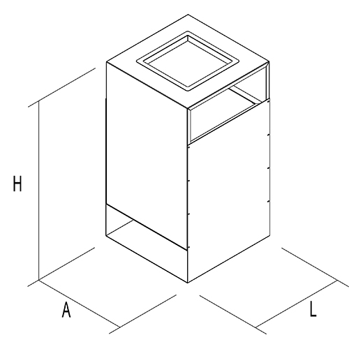 Capacidad: 180 lts. Acabado: Pintura electrostática con pretratamiento de fosfato de zinc y/o sandblast. Material: Acero al carbón. Colores: Amplia variedad. Vaciado: Mediante puerta trasera; retirando bolsa (incluye sujetador para bolsa) Anclaje: Atornillar, ahogar en cemento, o movible Referencias (mm):
