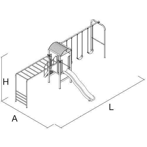 Incluye: Torre de acceso y Resbaladilla de polietileno rotomoldeado H 1.100 mts, L 2.478 mts; (de doble pared para parques públicos); Columpio de 3 plazas con asientos de polímero inyectados con refuerzos y con cadenas en acero galvanizado; y pasamanos Materiales: Estructura de acero; Barandales de lamina perforada; Piso antiderrapante Acabado: Pintura poliéster electroestática en polvo horneada. Tratamiento anticorrosivo a base de tinas de fosfatos y sellos orgánicos