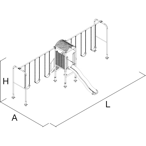 Incluye: Torre de acceso y resbaladilla de polietileno rotomoldeado de pared doble H 1,100mm L 2,478mm (de doble pared para parques públicos; Dos columpios c/uno de 3 plazas con asientos de polímero inyectado con ojillos y cadenas en acero galvanizado. Materiales: Estructura de acero; Barandales de lamina perforada; Piso antiderrapante Acabado: en pintura poliéster electroestática en polvo horneada. Tratamiento anticorrosivo a base de tinas de fosfatos y sellos orgánicos