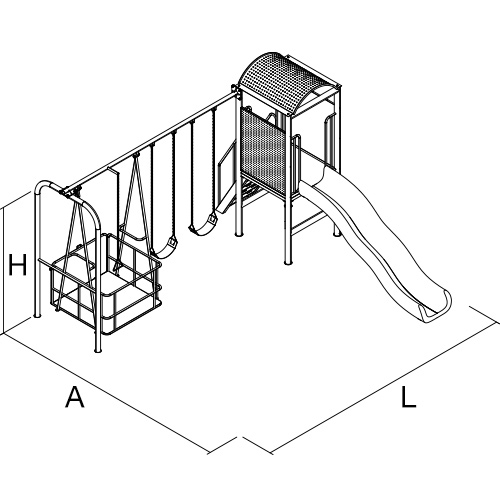 Incluye: Torre de acceso; y Resbaladilla de polietileno rotomoldeado de uso rudo; H 1,100mm L 2,478mm, columpio inclusivo y 2 asientos de polímero inyectados con refuerzos y con cadenas en acero galvanizado. Materiales: Canastilla con piso y puerta en acero antiderrapante; soportes de canastilla y barandales de canastilla en tubular de acero; Dos asientos de polímero con refuerzos y cadenas de acero galvanizado. Acabado: Pintura poliéster electroestática en polvo horneada. Tratamiento anticorrosivo a base de tinas de fosfatos y sellos orgánicos